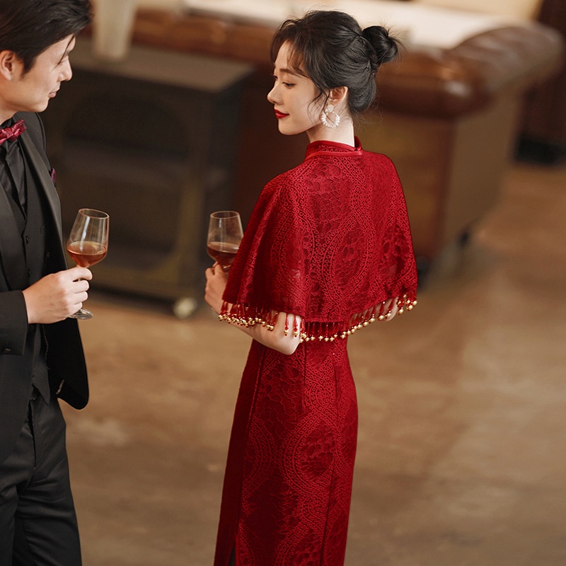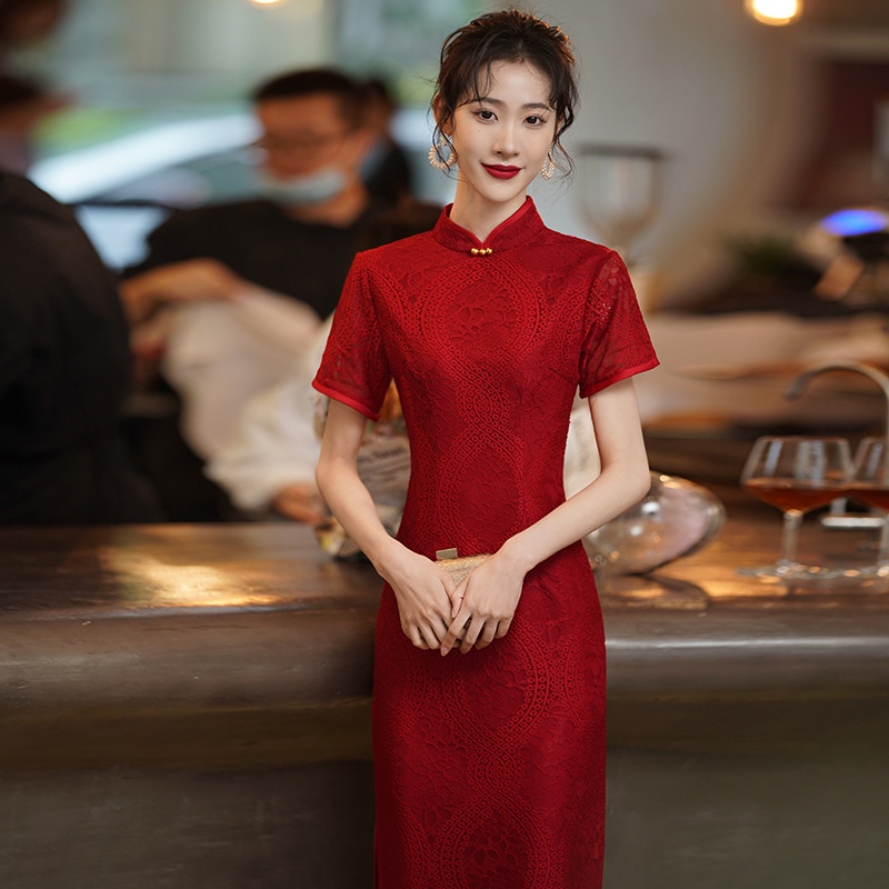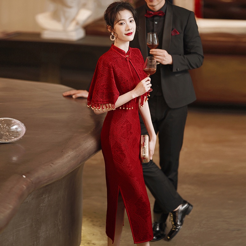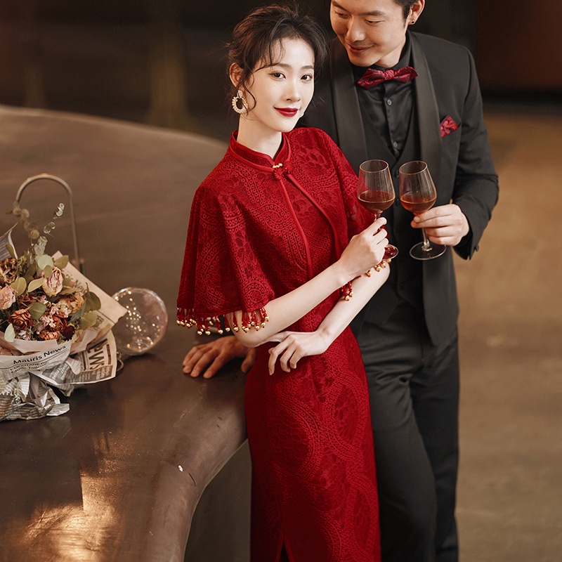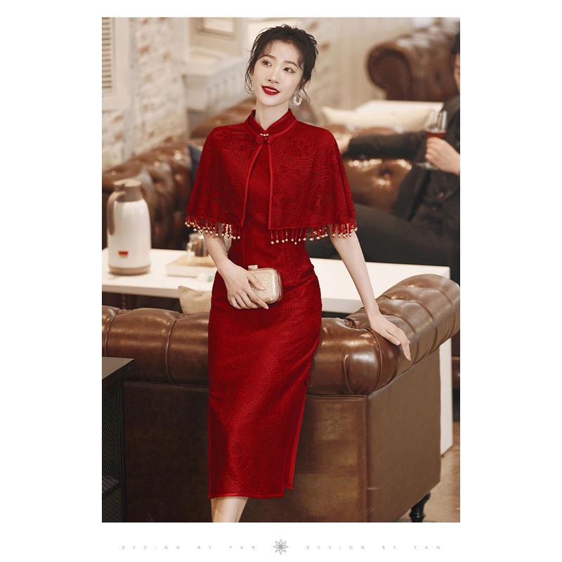 Bộ sườn xám màu đỏ phong cách cổ điển Trung Quốc thời trang xuân thu cho nữ
