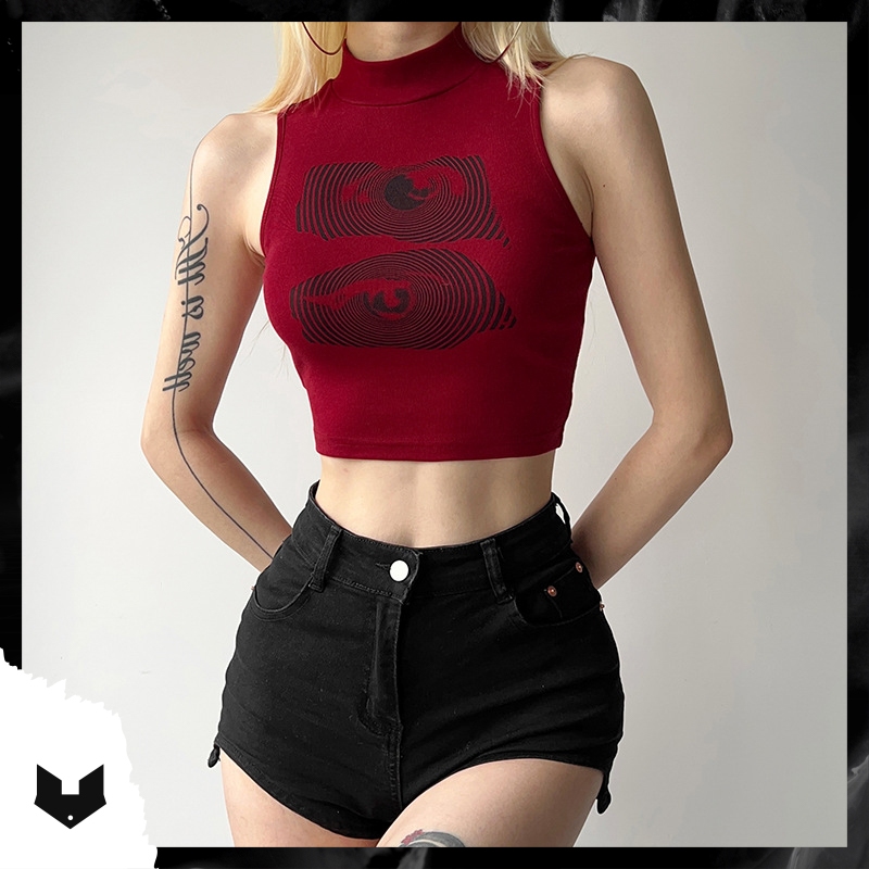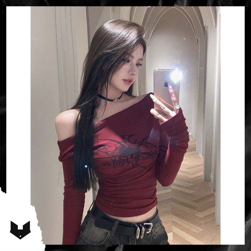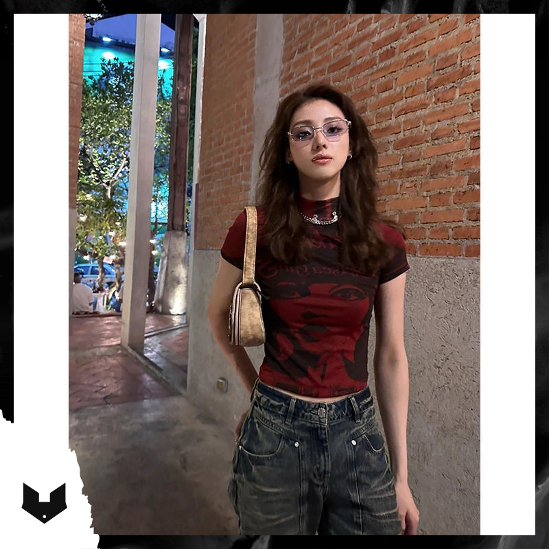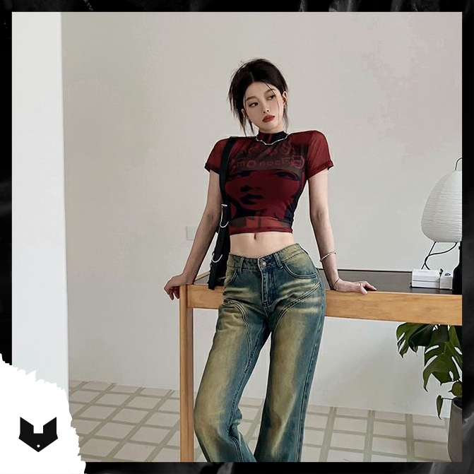 (Sẵn S M L_Ảnh thật) Áo baby tee thun croptop cộc tay cổ 3p đỏ đô đen in hình cô gái phong cách Hàn Quốc sexy dance
