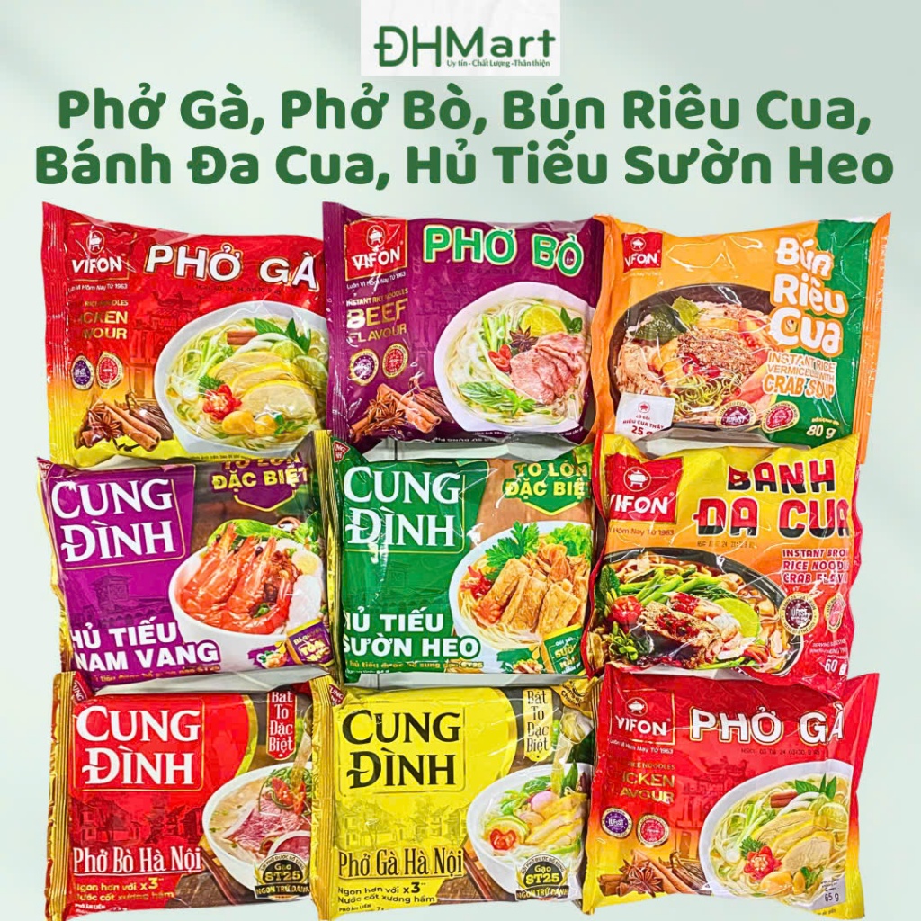 10 gói Phở Gà, Phở Bò Vifon, Bún Riêu Cua, Bánh Đa Cua, Hủ Tiếu Sườn Heo, Hủ Tiếu Nam Vang Cung Đình Các Loại