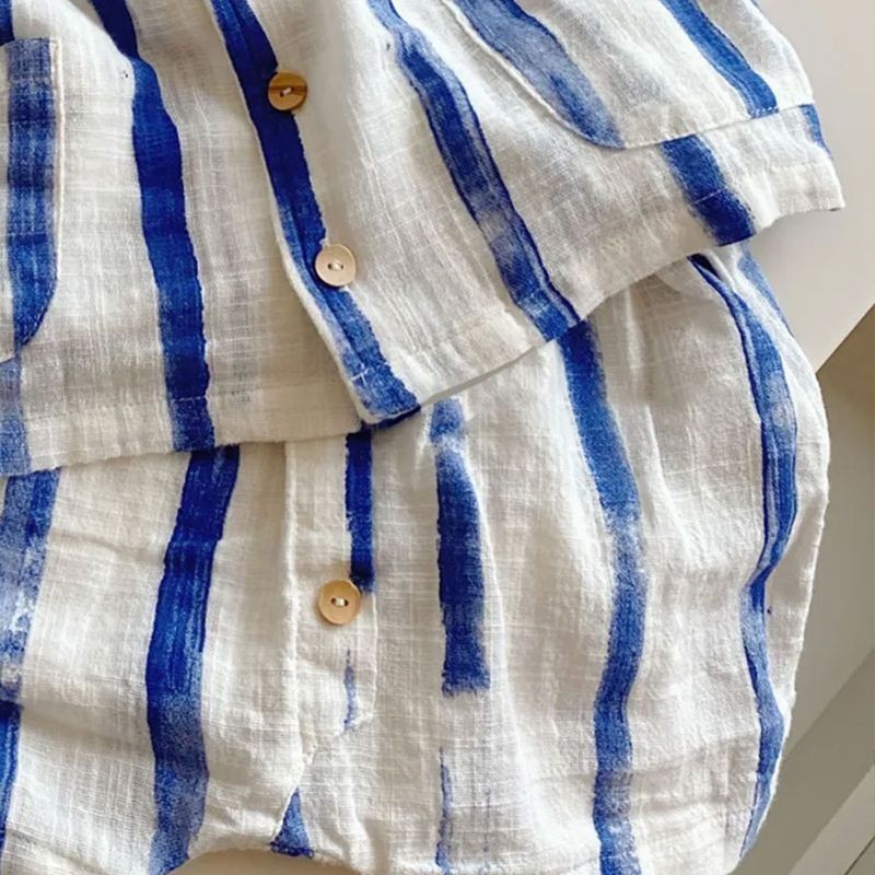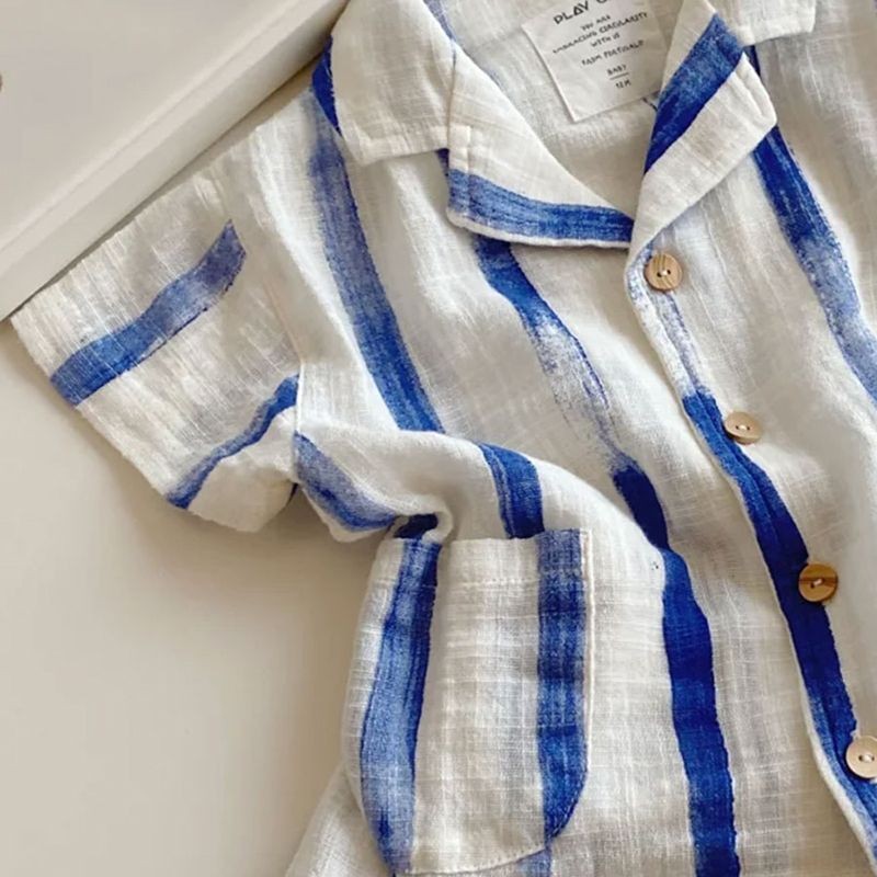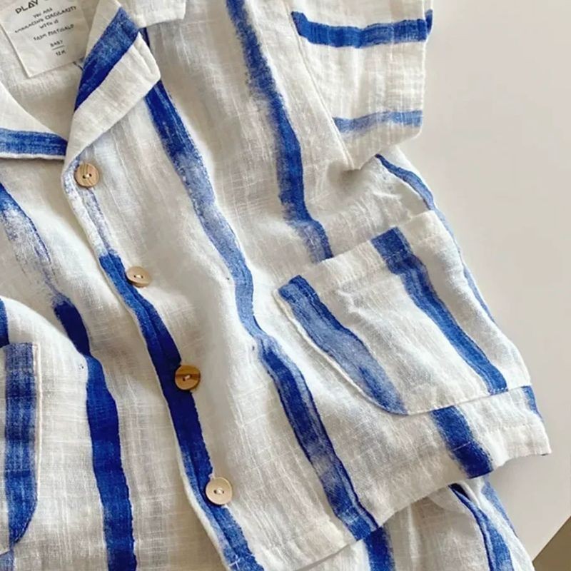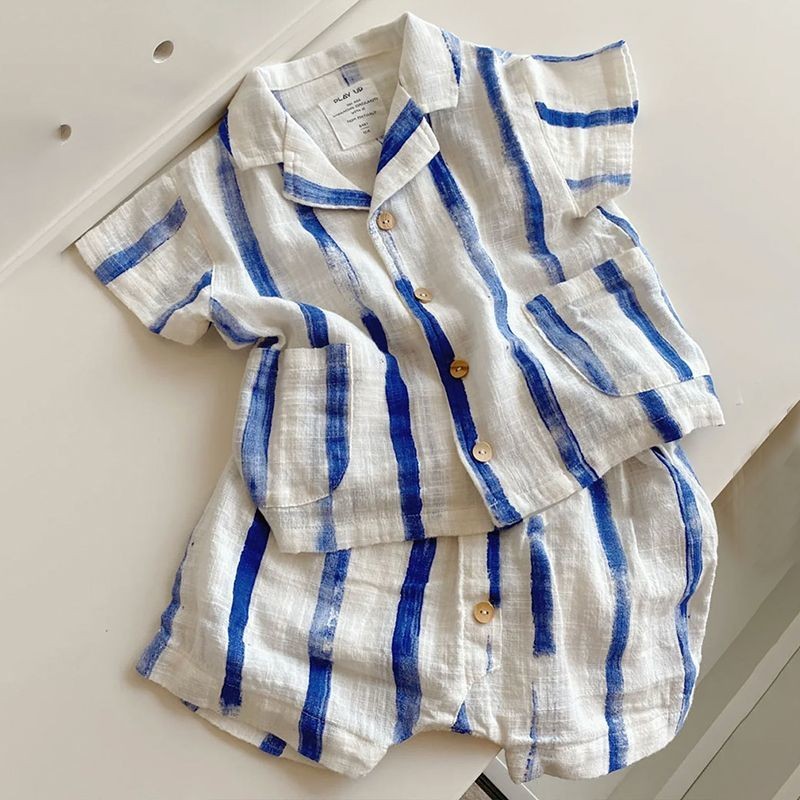 Bộ Bé Trai 2025 Mới Mỏng Thường Ngày Cotton Và Vải Lanh Chặn Màu Sọc Lớn Bỏ Túi + Quần Short Bộ Hai Mảnh