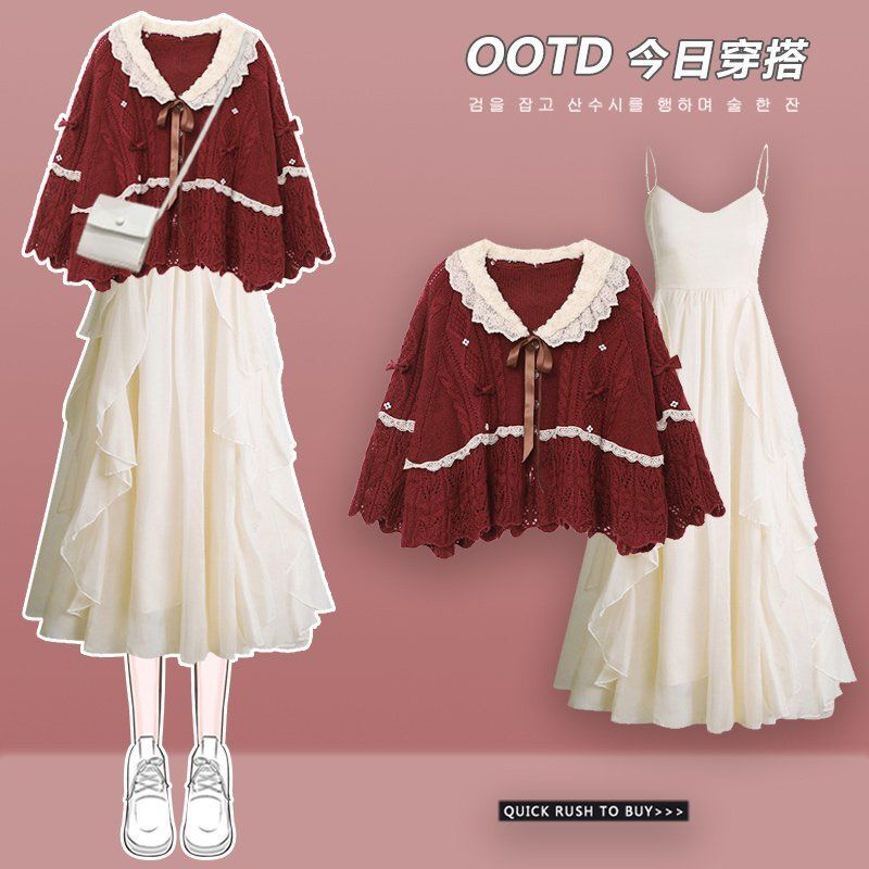 [YU]Set 2 Món Phong Cách Thu Đông Mặc Một Bộ Đồ Len Màu Đỏ Giáng Sinh Mới, Mix Váy 2 Dây Công Chúa Dễ Thương