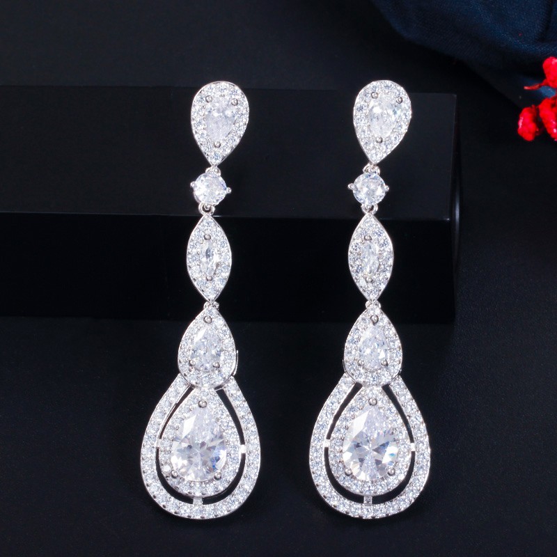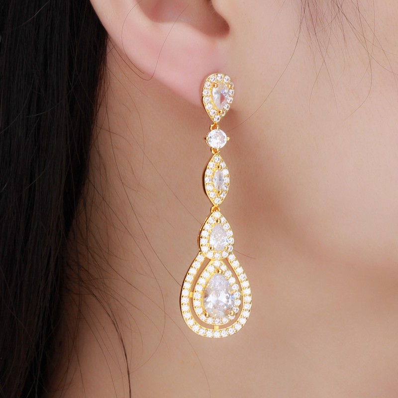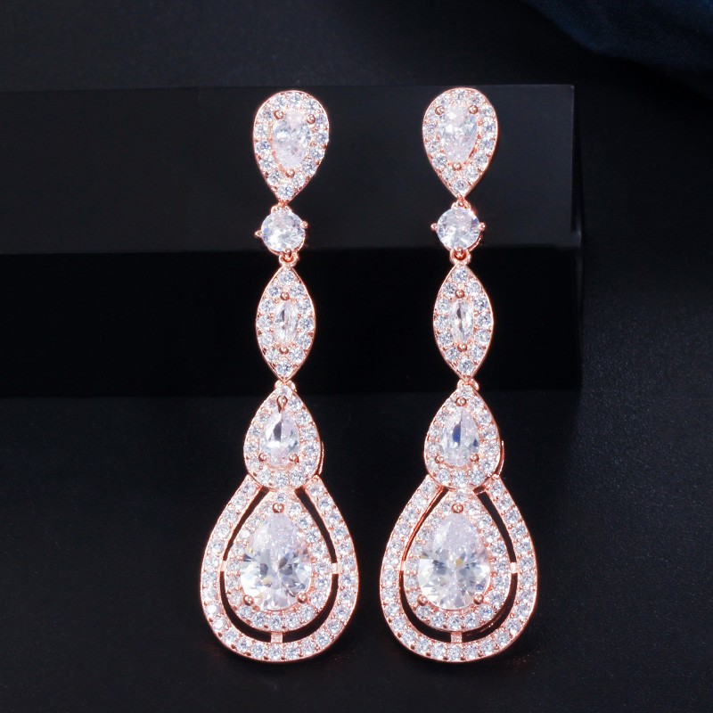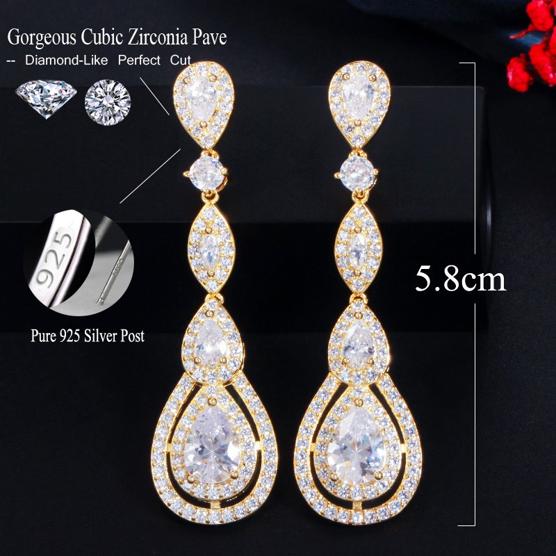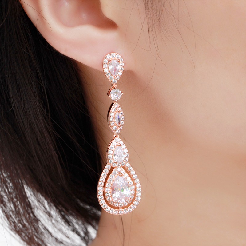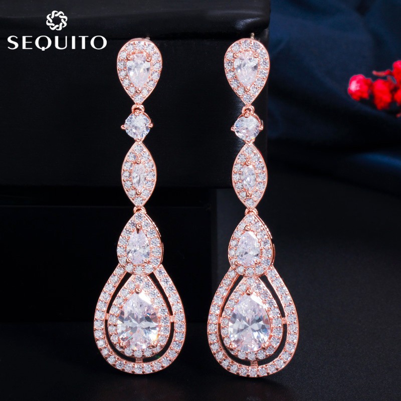 SEQUITO Vintage Tuyệt Đẹp Dazzling CZ Pha Lê Dài Tòn Nguyên Chất Bạc 925 Bài Bông Tai Cho Nữ Cô Dâu Cưới Hoa Hồng Vàng Trang Sức E351