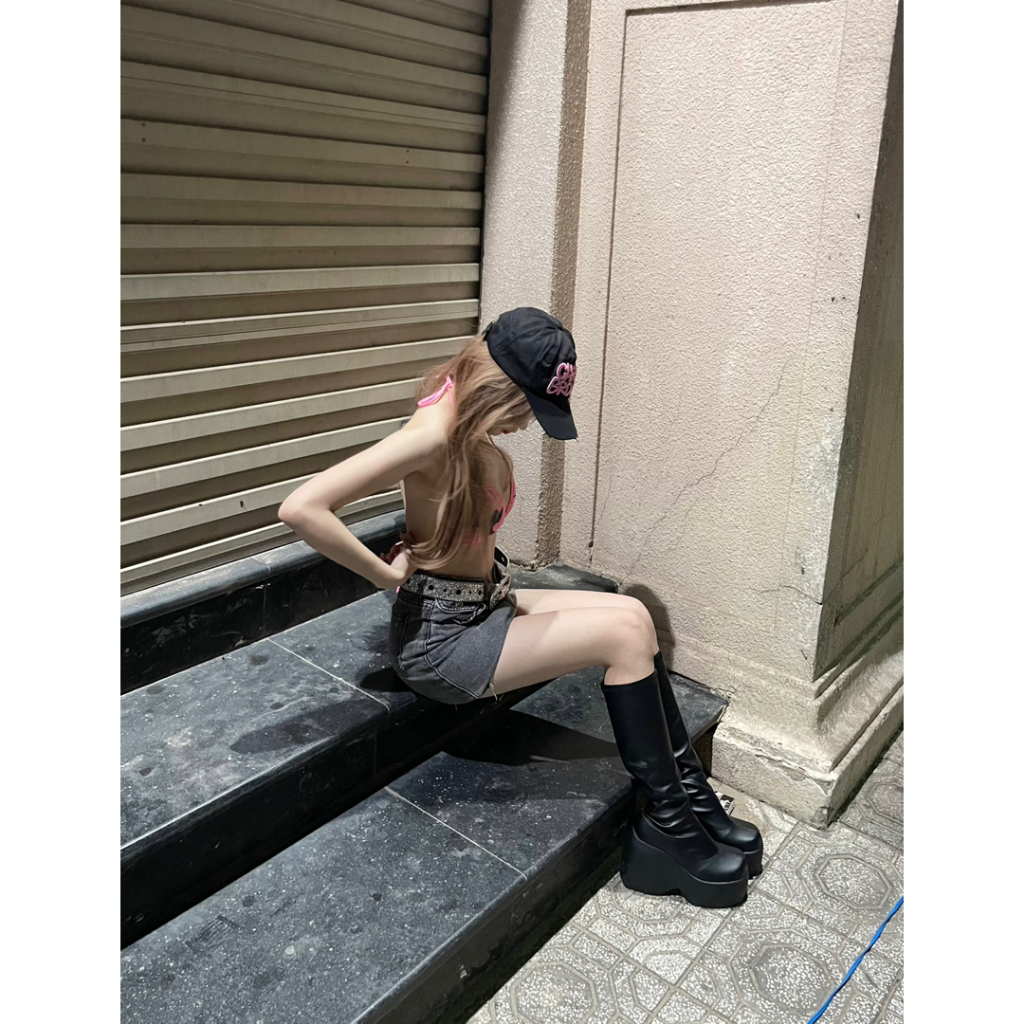 Boot nữ Gothic Đế Bánh Mì 12 cm Phong Cách Y2K Chiều Cao Khủng, Bốt đùi nữ đế sóng mũi tròn phong cách Cá Tính