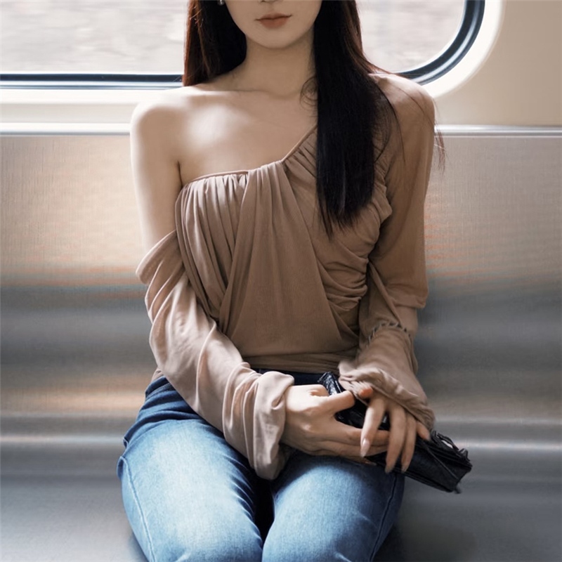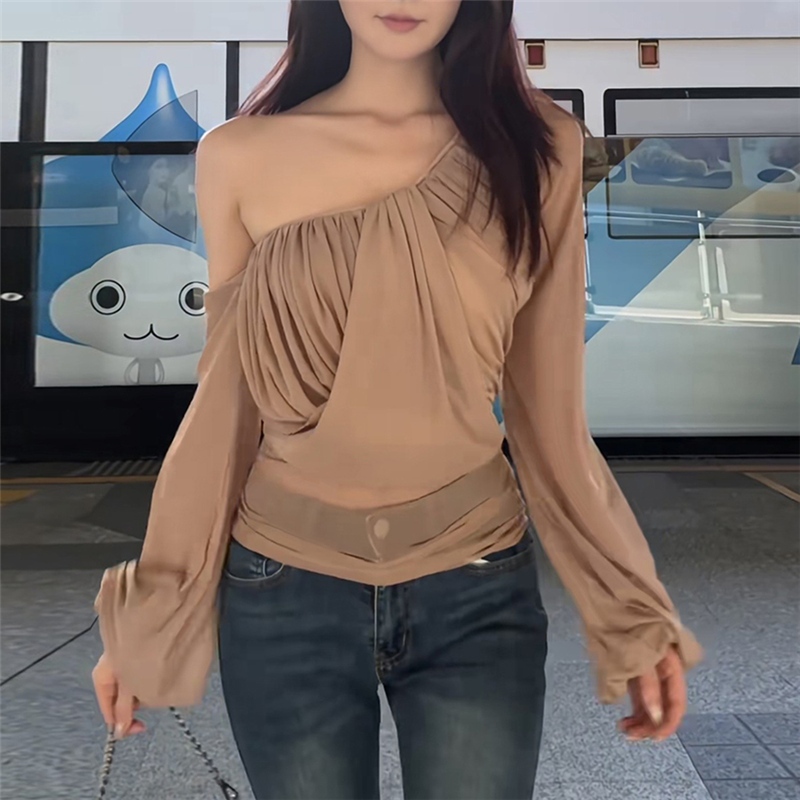 Weird Puss Kỳ Dị Puss Chắc Chắn Skinny Áo Thun Dài Tay Không Đều Chắp Vá Ruched Off Vai Nữ Thời Trang Ngọt Ngào Phong Cách Đa Năng