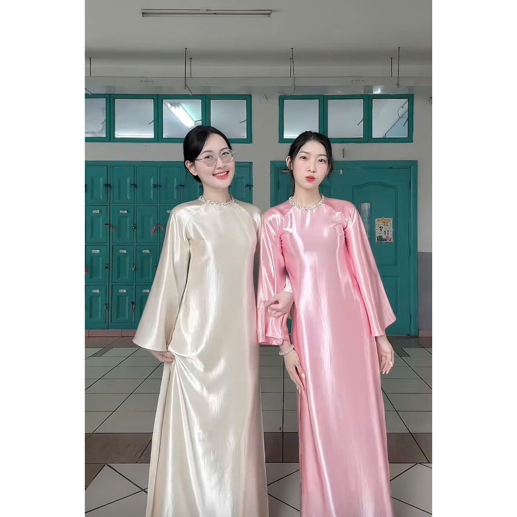 Áo Dài Dáng Xuông Lụa Ý Tráng Gương, Cổ Tròn Đính Đá Sang Trọng,Tay Dài Loe Rộng - Áo Dài Thanh Hà