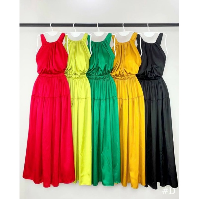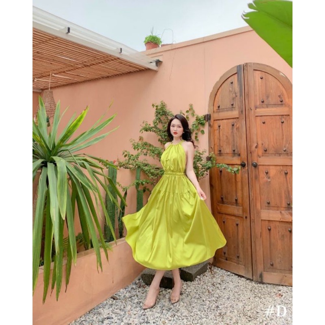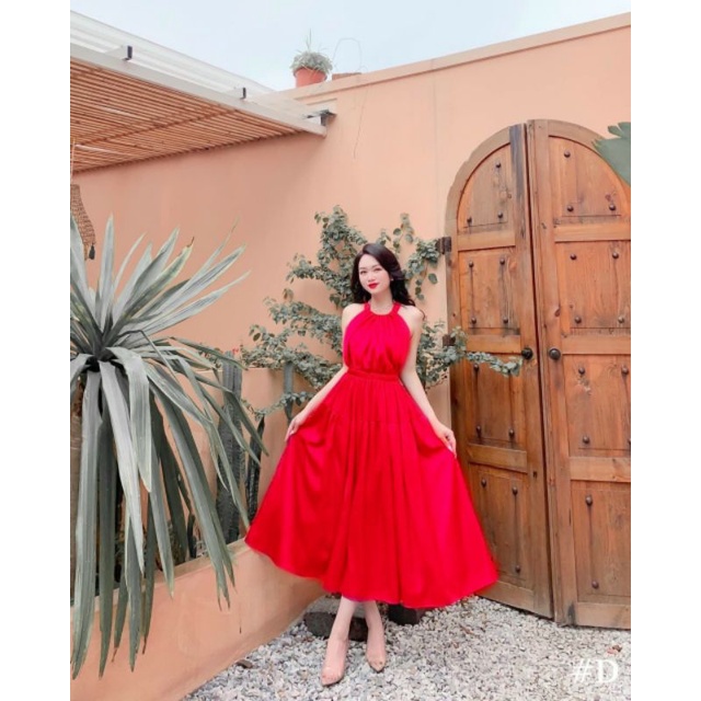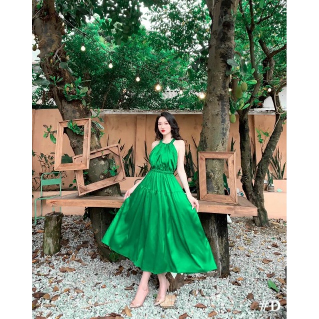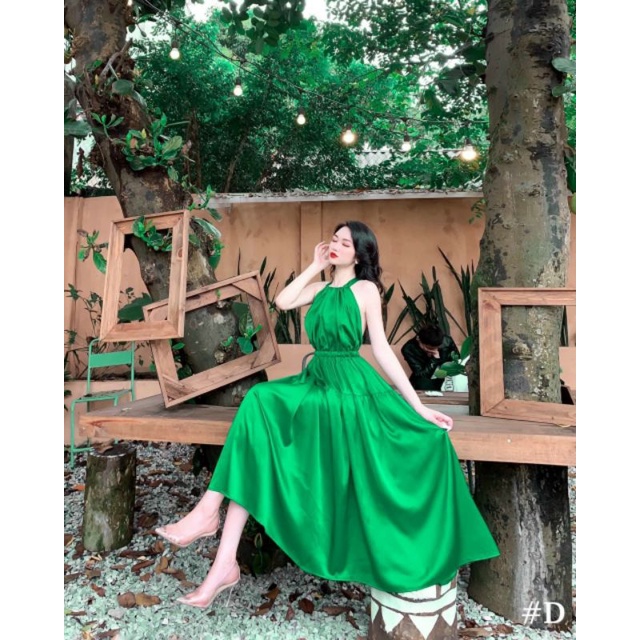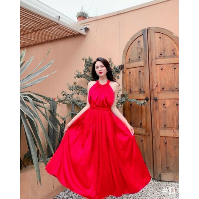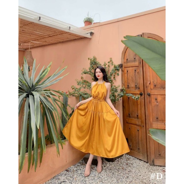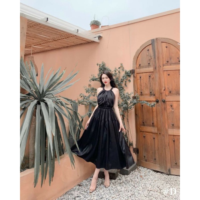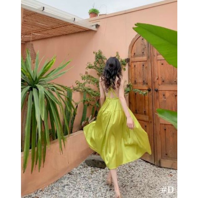 Váy đầm lụa maxi cổ yếm chéo dây hở lưng