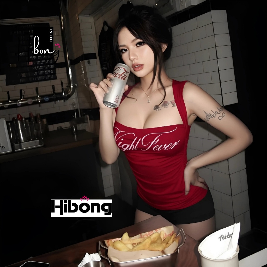SÁT NÁCH CÚP NGỰC NHÚN EO IN CHỮ NIGHT FEVER Chất Borip Lụa DD10, Áo Thun Nữ Sexy Ôm Body Viền Vai HIBONG
