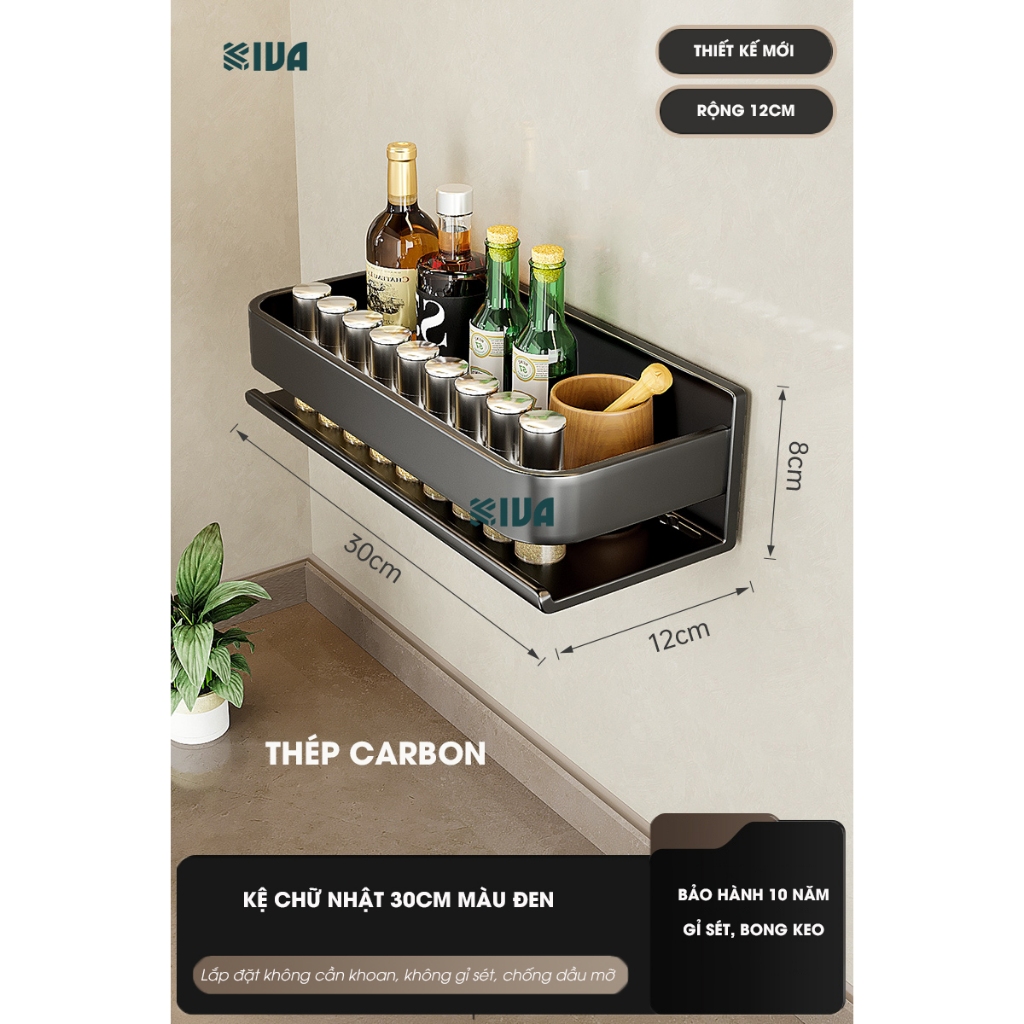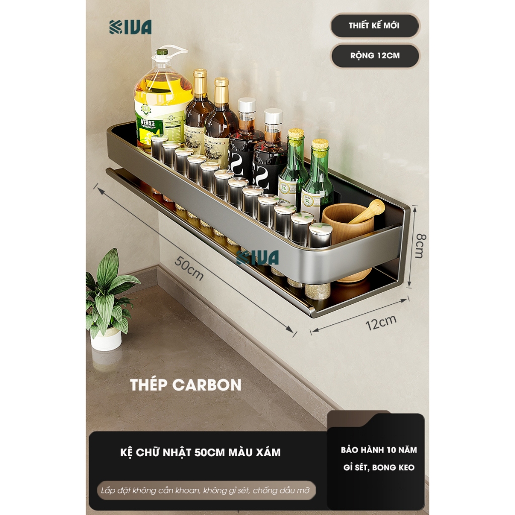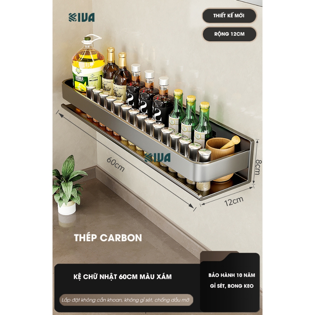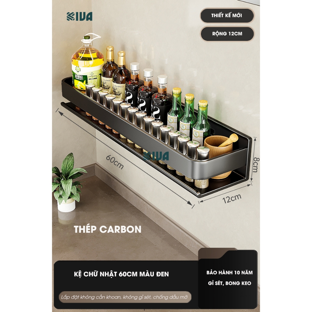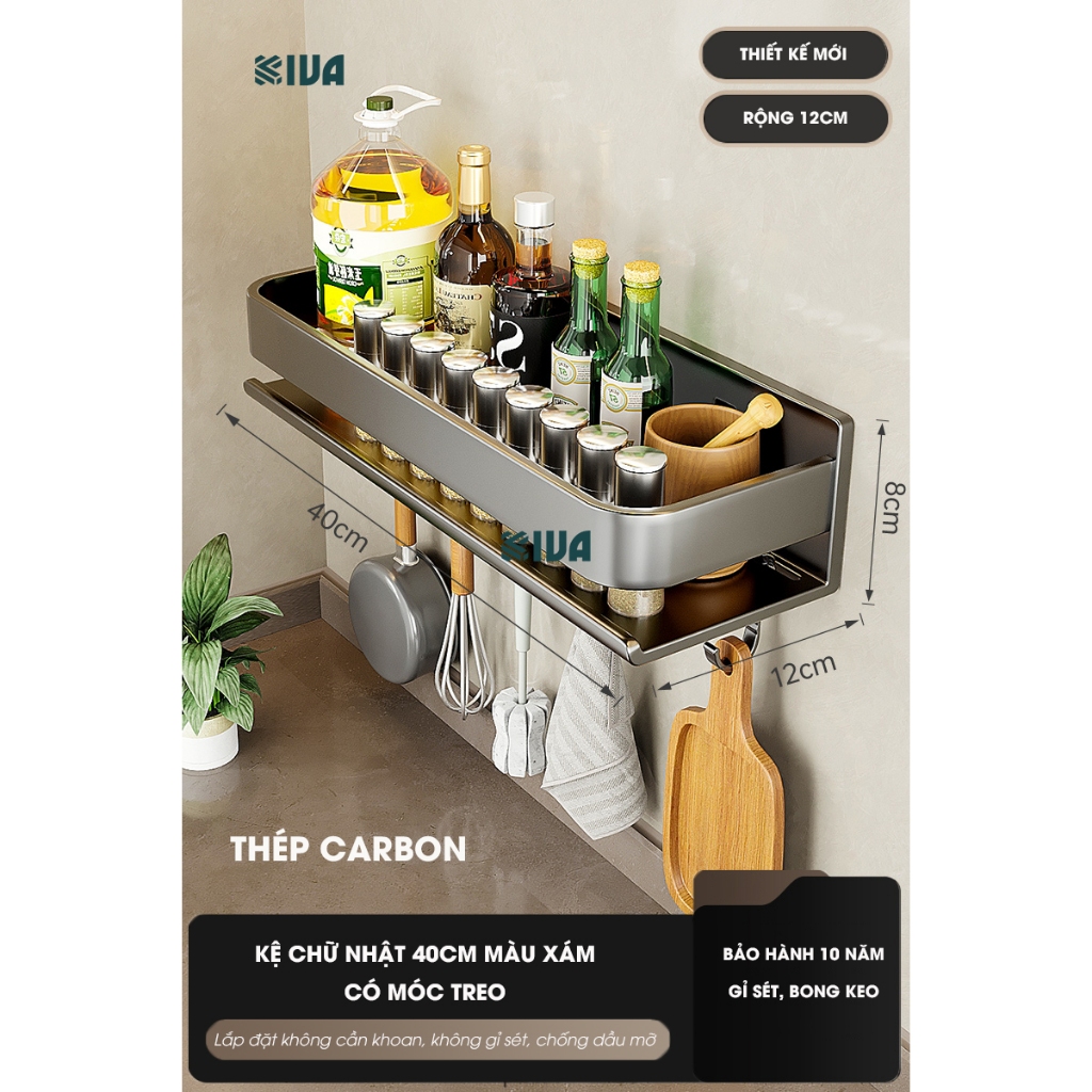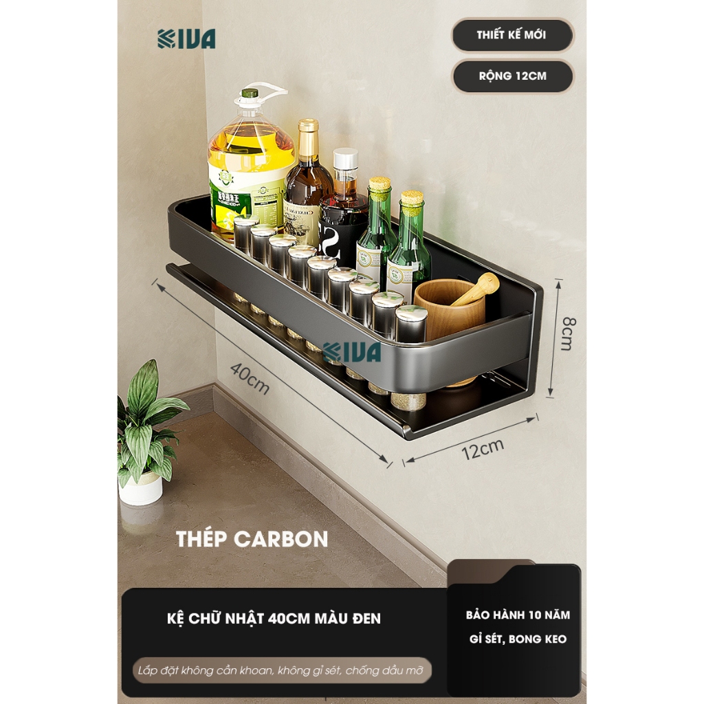 Kệ đựng, để gia vị nhà bếp treo tường KIVa, chất liệu thép Carbon, lắp đặt dán tường, khoan tường.