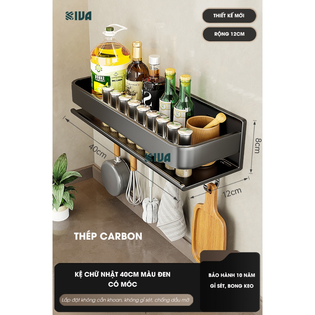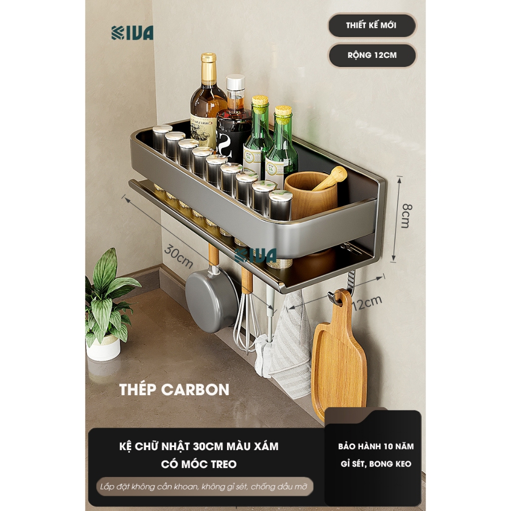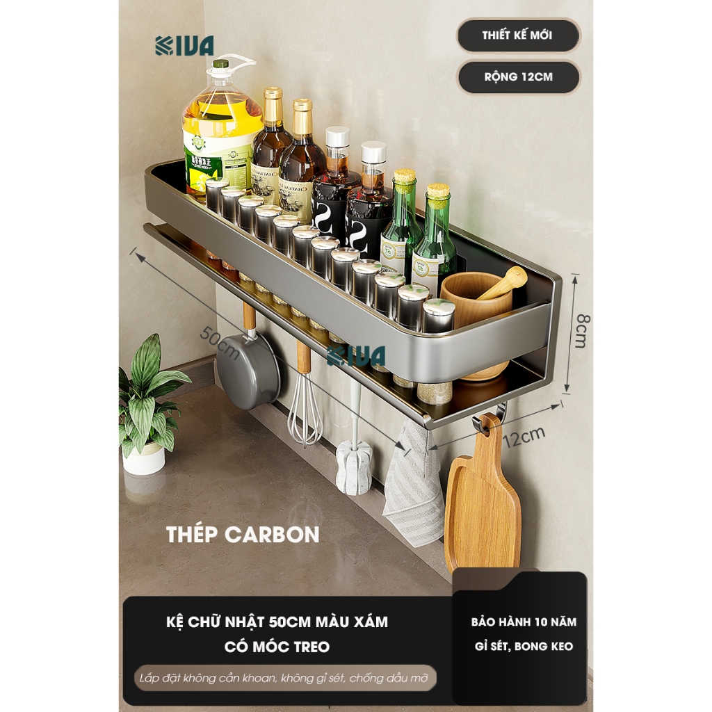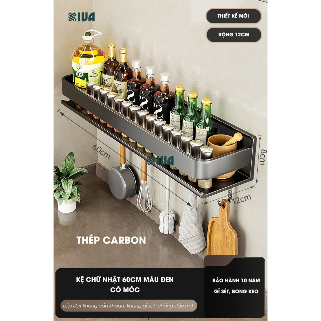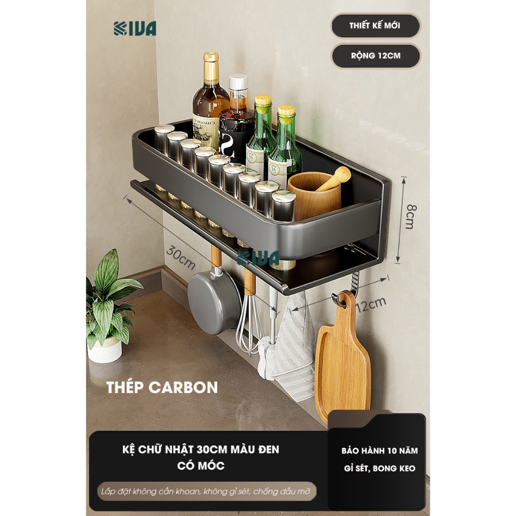 Kệ đựng, để gia vị nhà bếp treo tường KIVa, chất liệu thép Carbon, lắp đặt dán tường, khoan tường.