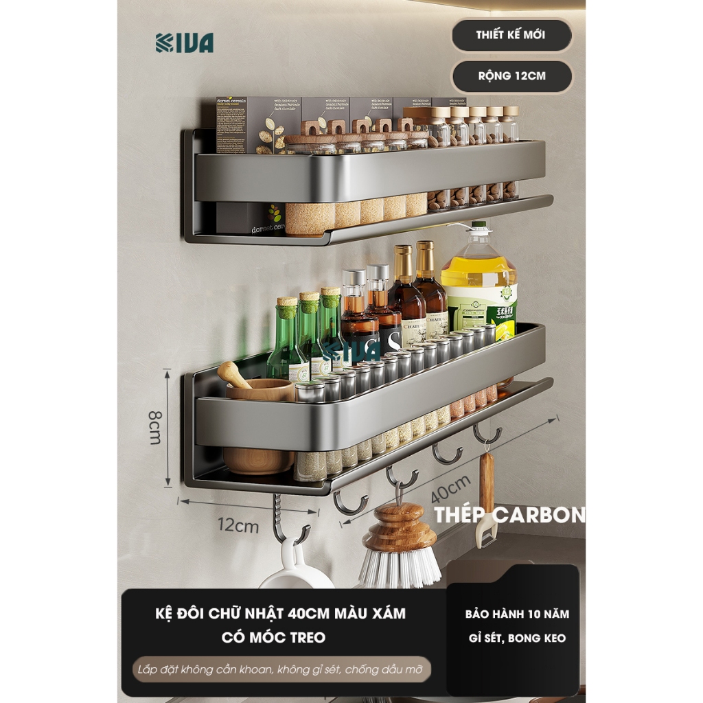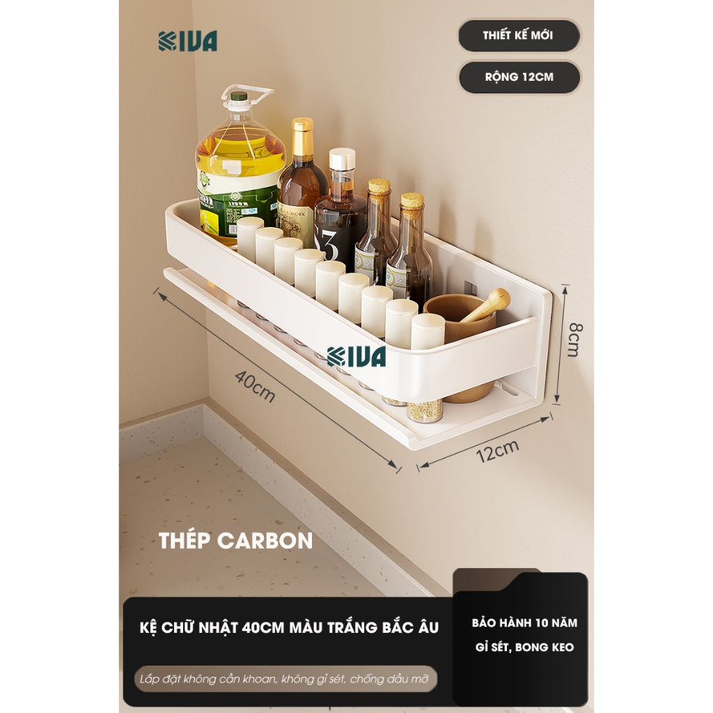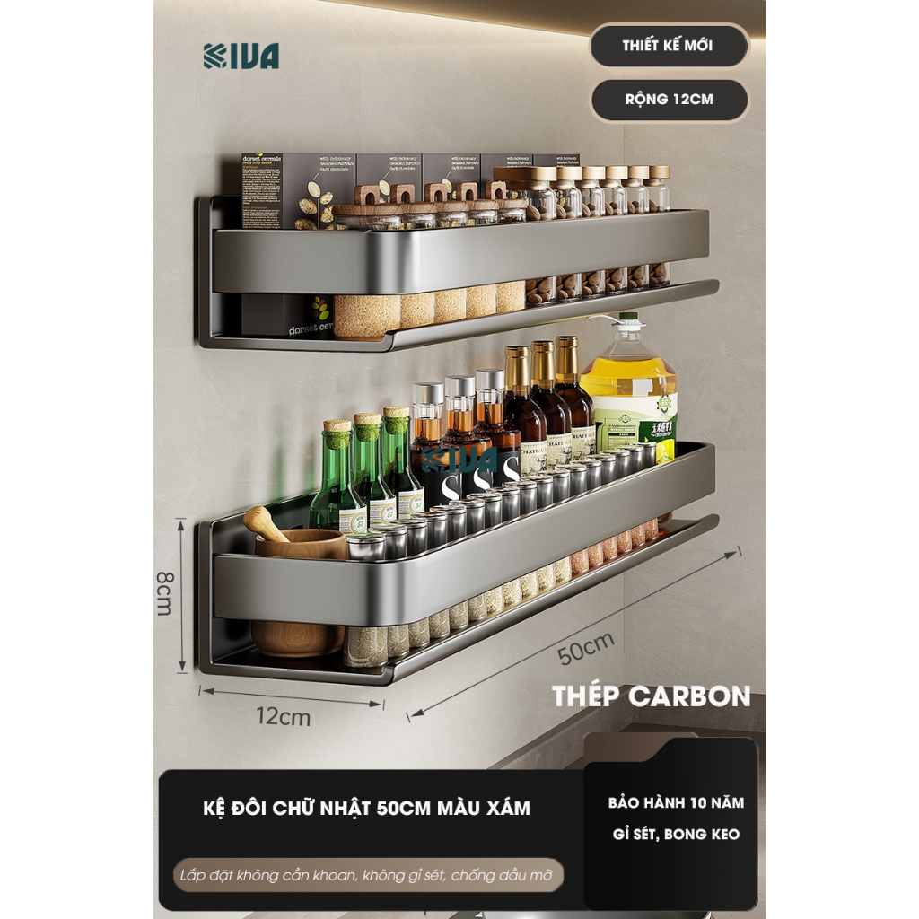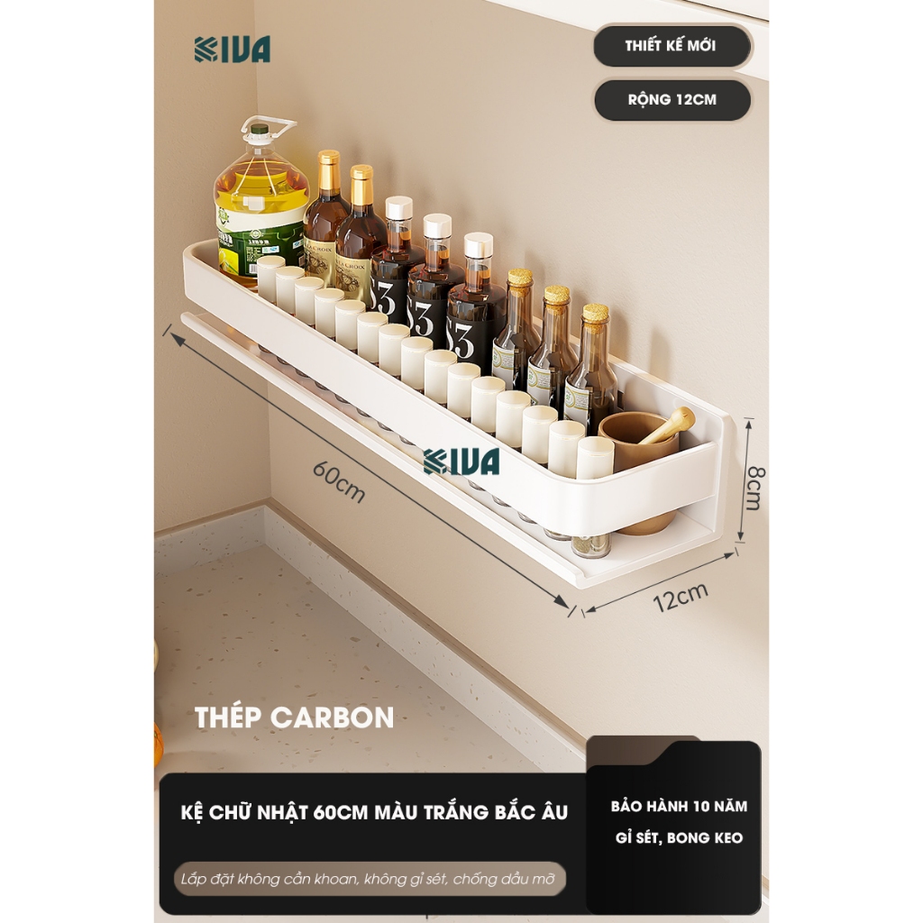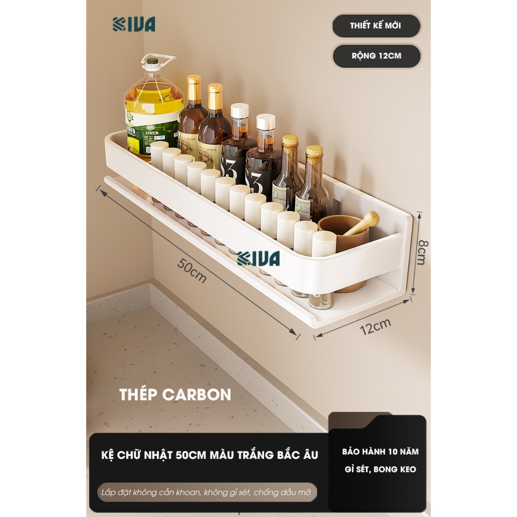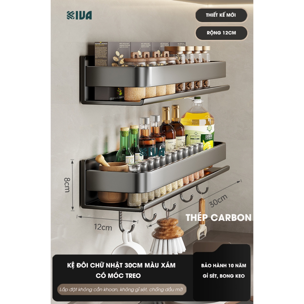 Kệ đựng, để gia vị nhà bếp treo tường KIVa, chất liệu thép Carbon, lắp đặt dán tường, khoan tường.