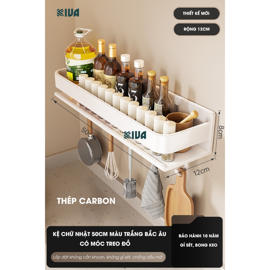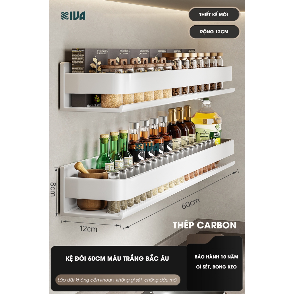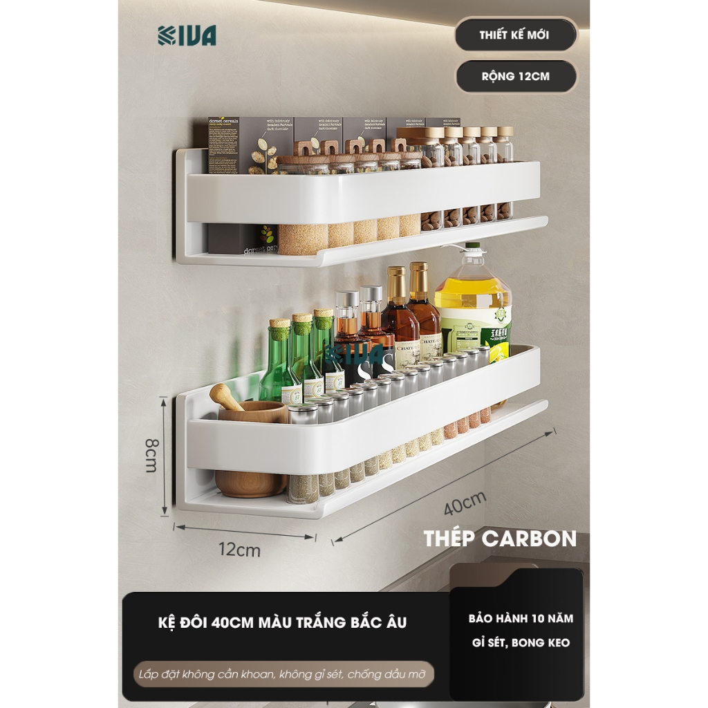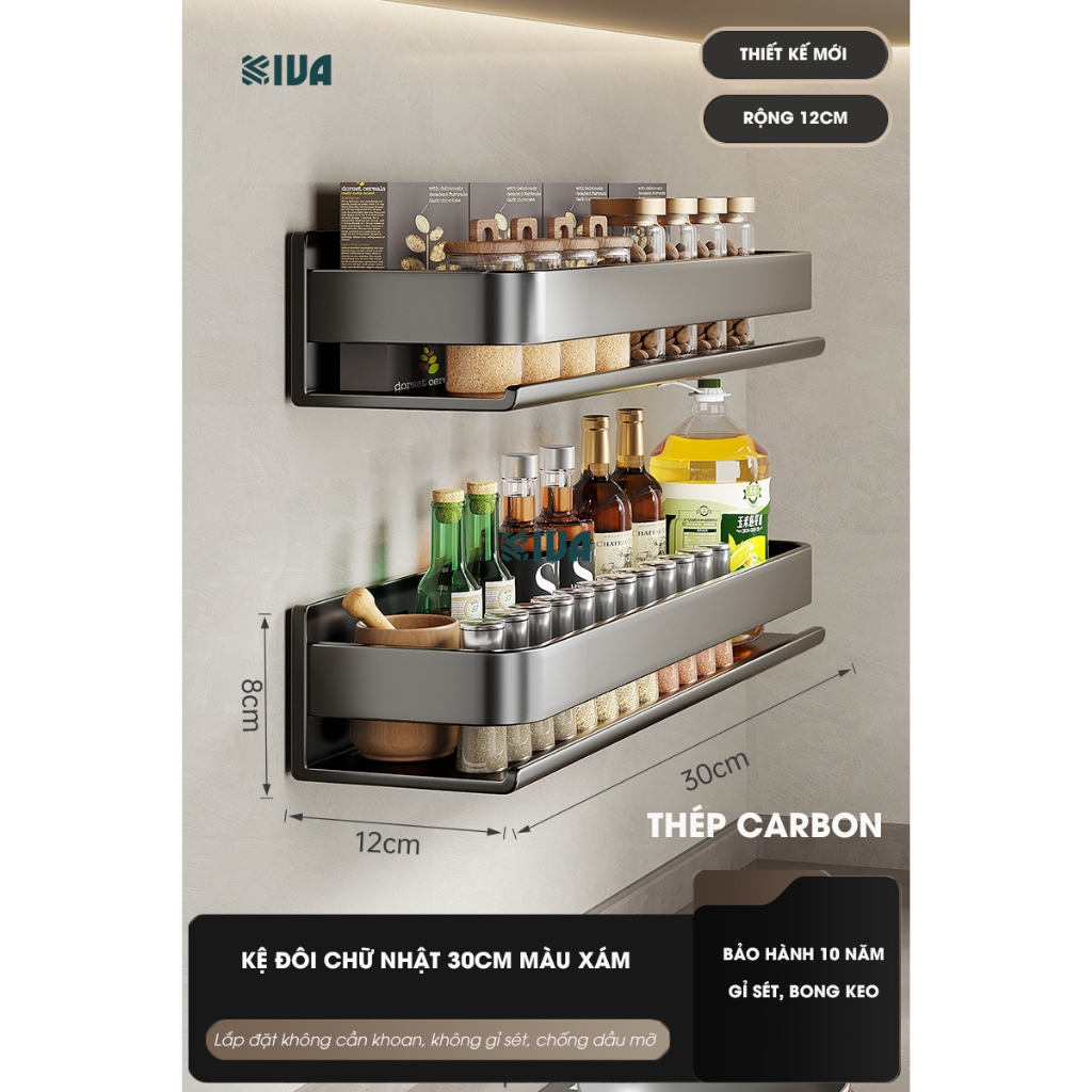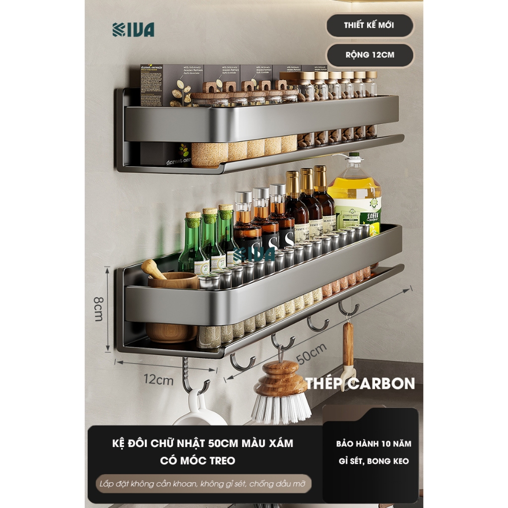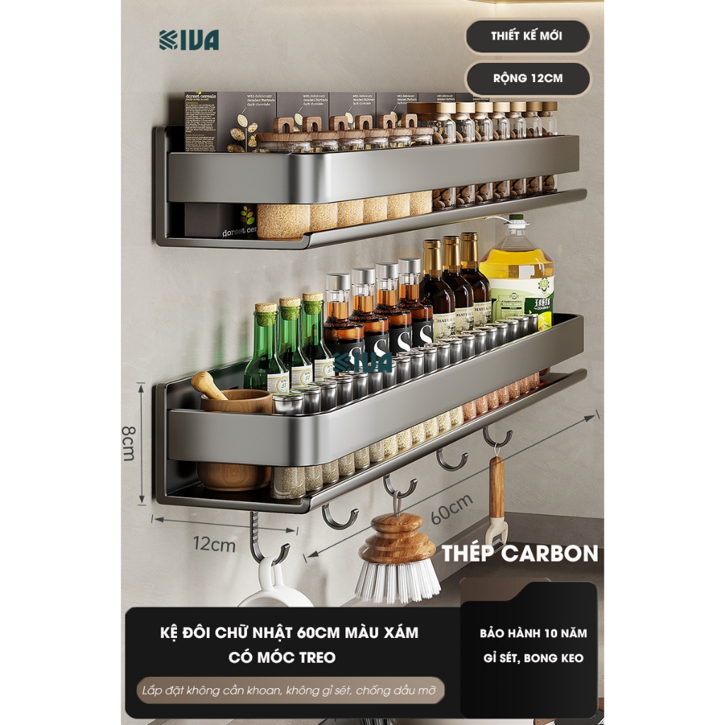 Kệ đựng, để gia vị nhà bếp treo tường KIVa, chất liệu thép Carbon, lắp đặt dán tường, khoan tường.