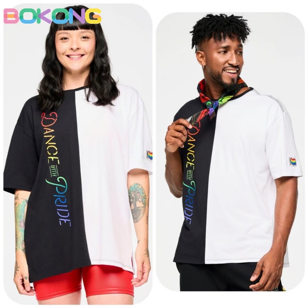 Áo thun thể dục Zumba màu cầu vồng, thiết kế giả hai mảnh trắng, lưới đen trắng, co giãn và nhanh khô.