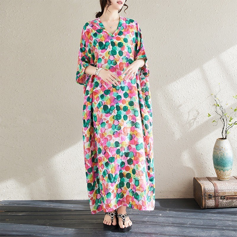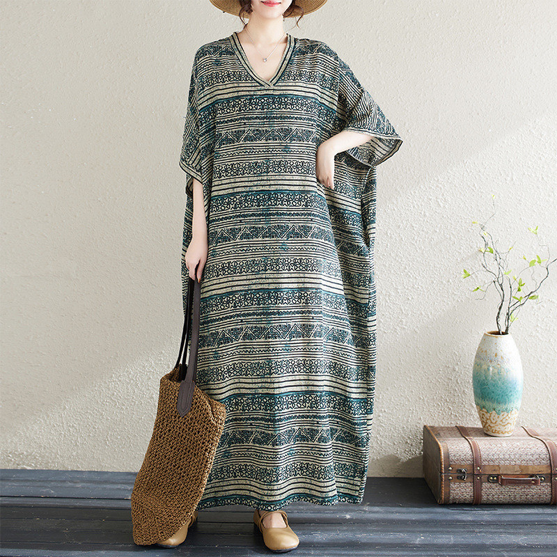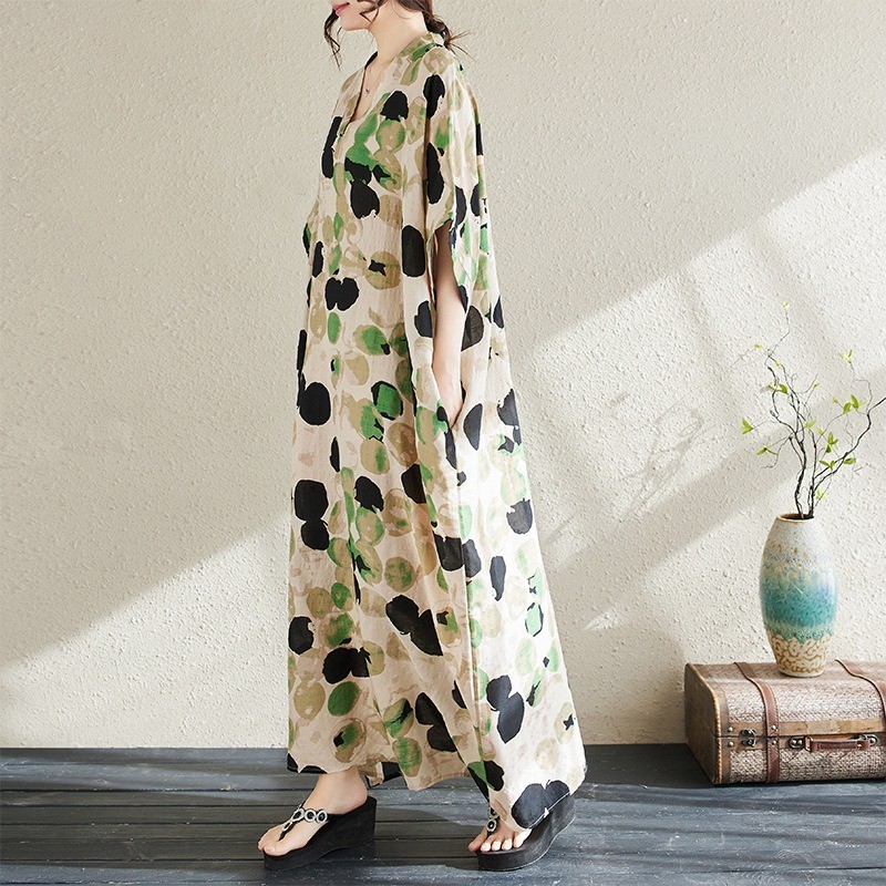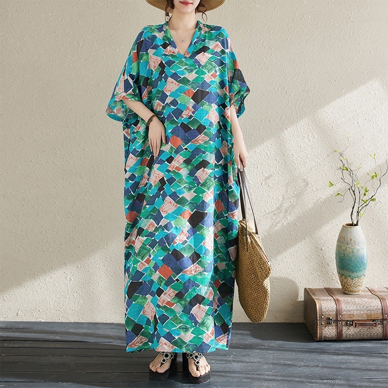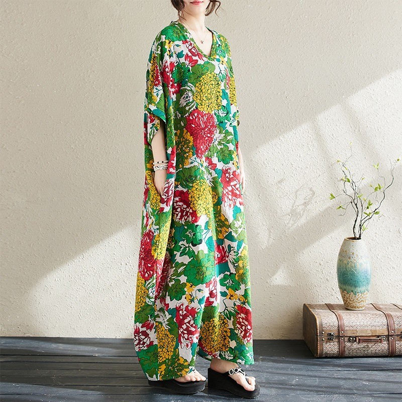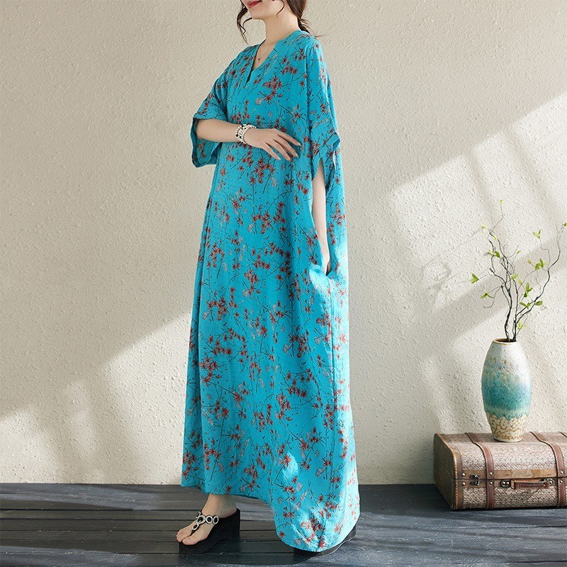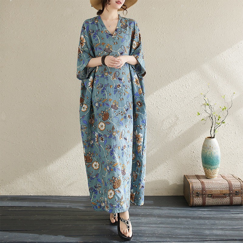 Đầm Maxi Nữ Mùa Hè 3 / 4 Tay Vải Lanh Cotton Oversize In Hoa Đi Biển Ngày Lễ Cổ Chữ V Dài
