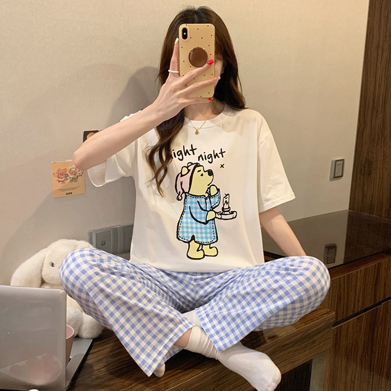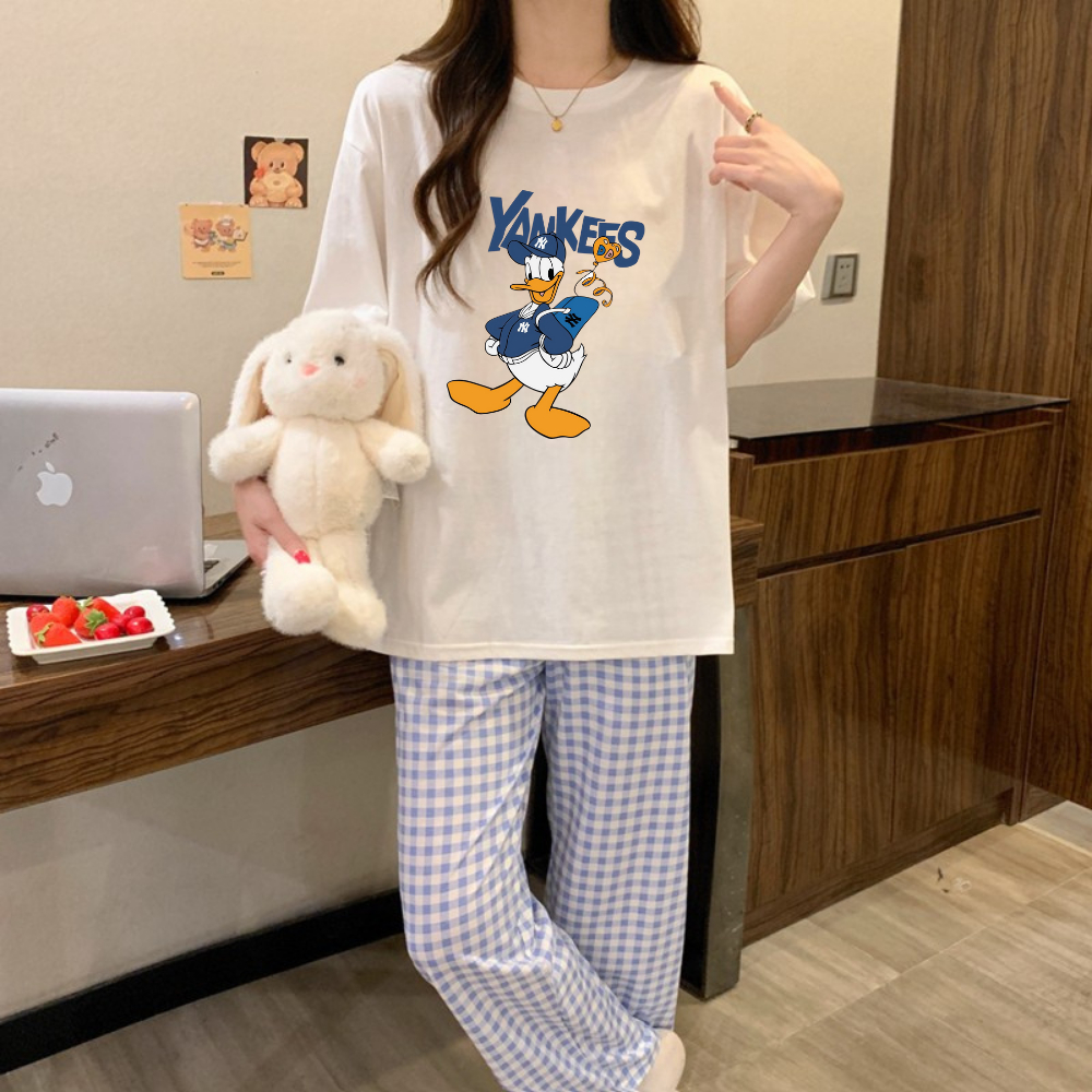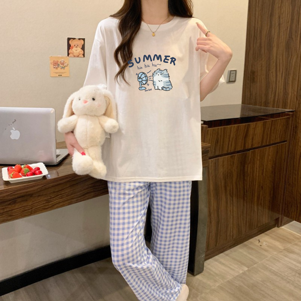 Bộ Quần Dài Kate XANH DƯƠNG mặc nhà Áo Cotton TRẮNG 4C Dày Dặn in hình - NEONVN STUDIO đồ bộ mặc nhà thoáng mát