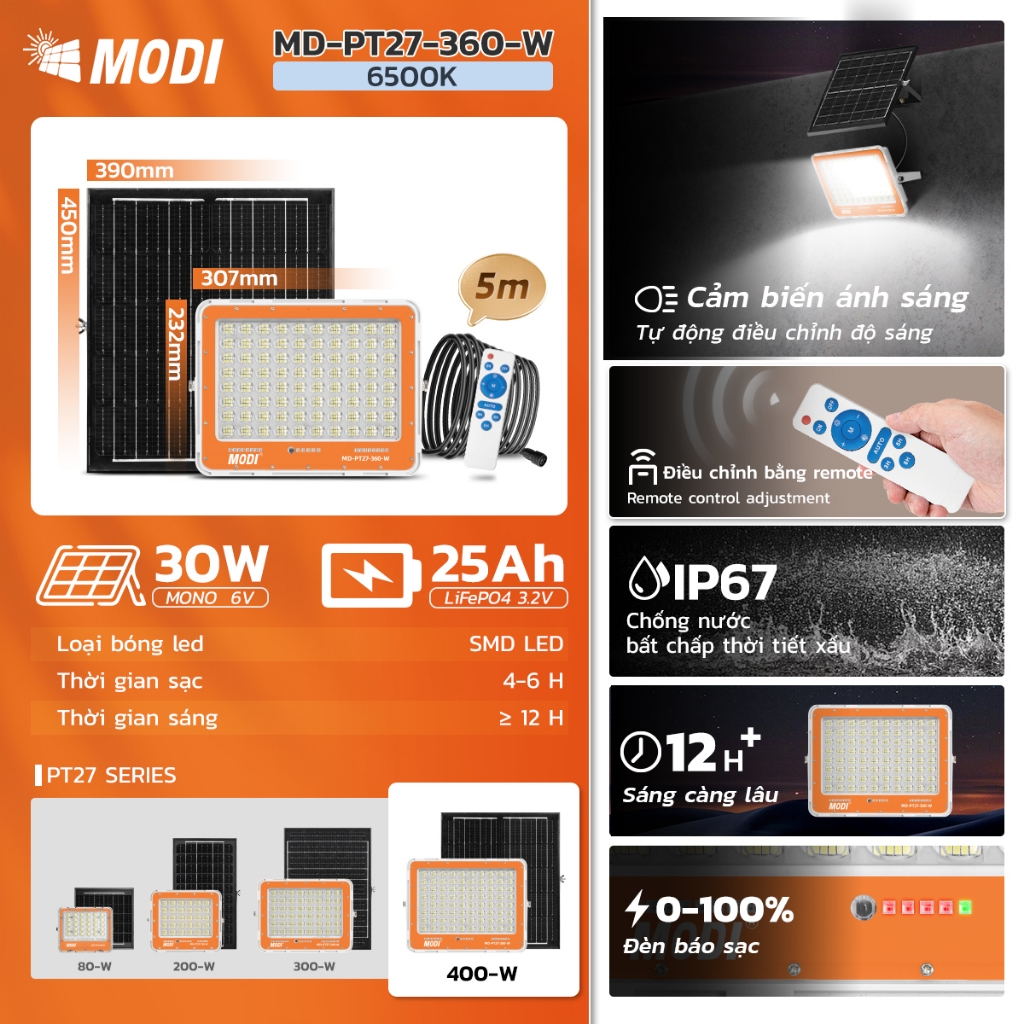 Đèn Pha LED Chống Chói Năng Lượng Mặt Trời MODI SOLAR 80W, 120W, 240W, 360W Ánh Sáng Trắng