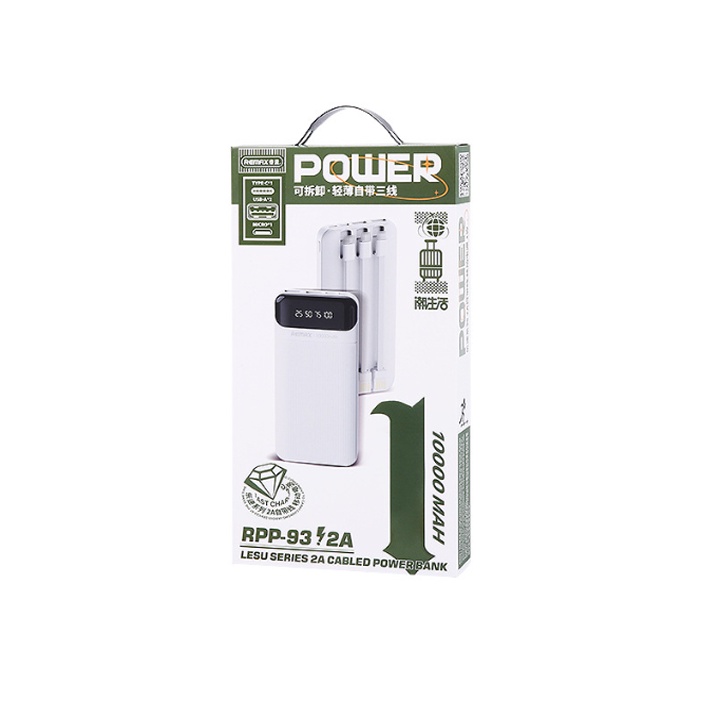 Pin Dự Phòng Remax RPP-93 10000mAh 2 cổng USB max 2.0A tích hợp đèn LED và 3 cáp sạc cổng Type C, ai phon, Micro USB