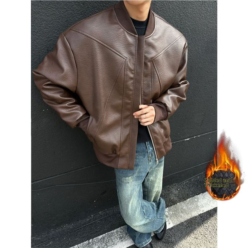 Áo khoác da PU cổ đứng mùa đông, đệm cotton dày, thời trang