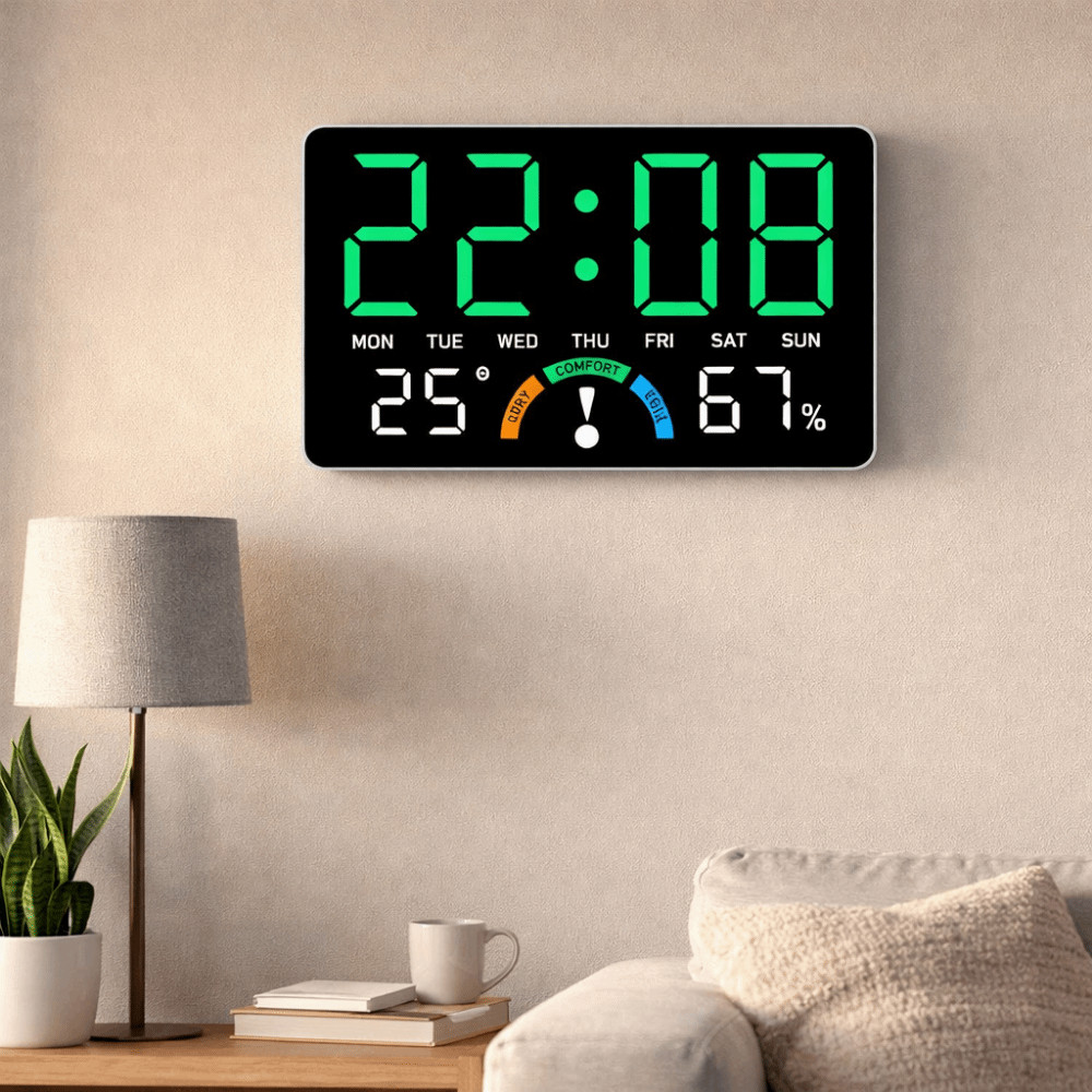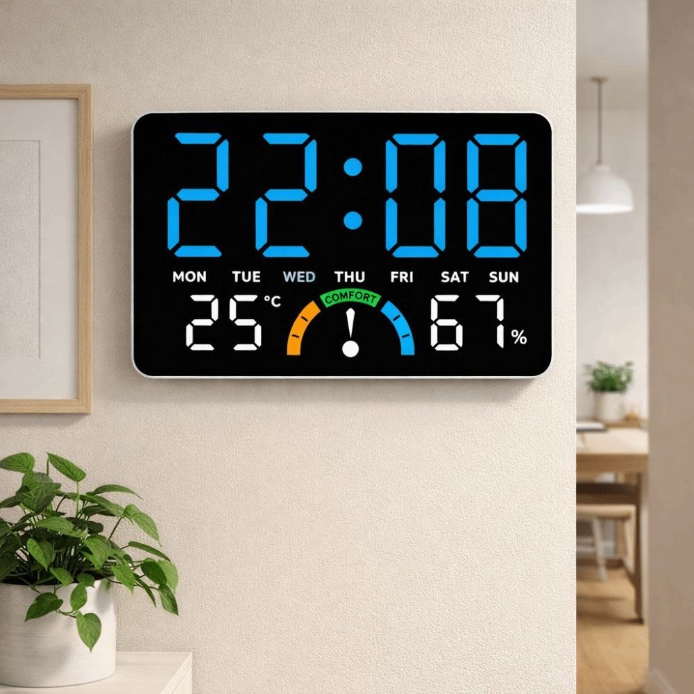 SDFG Đồng hồ treo tường kỹ thuật số SDFG, Thời gian / Nhiệt độ / Độ ẩm Đồng hồ báo thức LED màn hình lớn, Thiết kế hiện đại Nhắc nhở thoải mái Báo thức kép Hiển thị ngày Đồng hồ bàn điện tử Trang trí nội thất