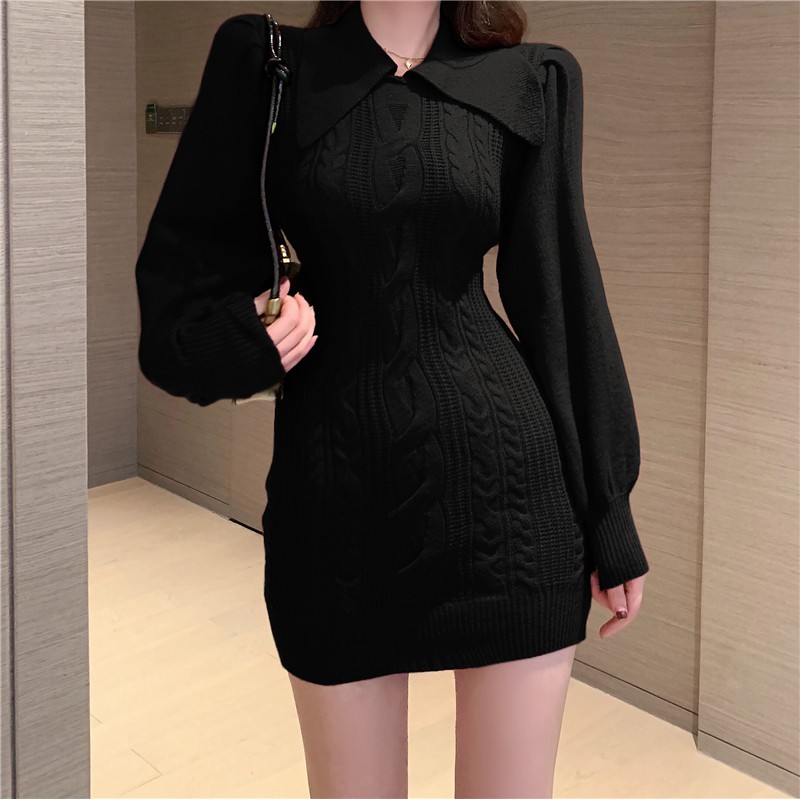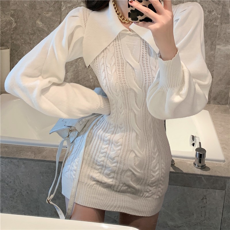 (Sẵn Trắng)Váy len ôm cổ bẻ tay phồng
