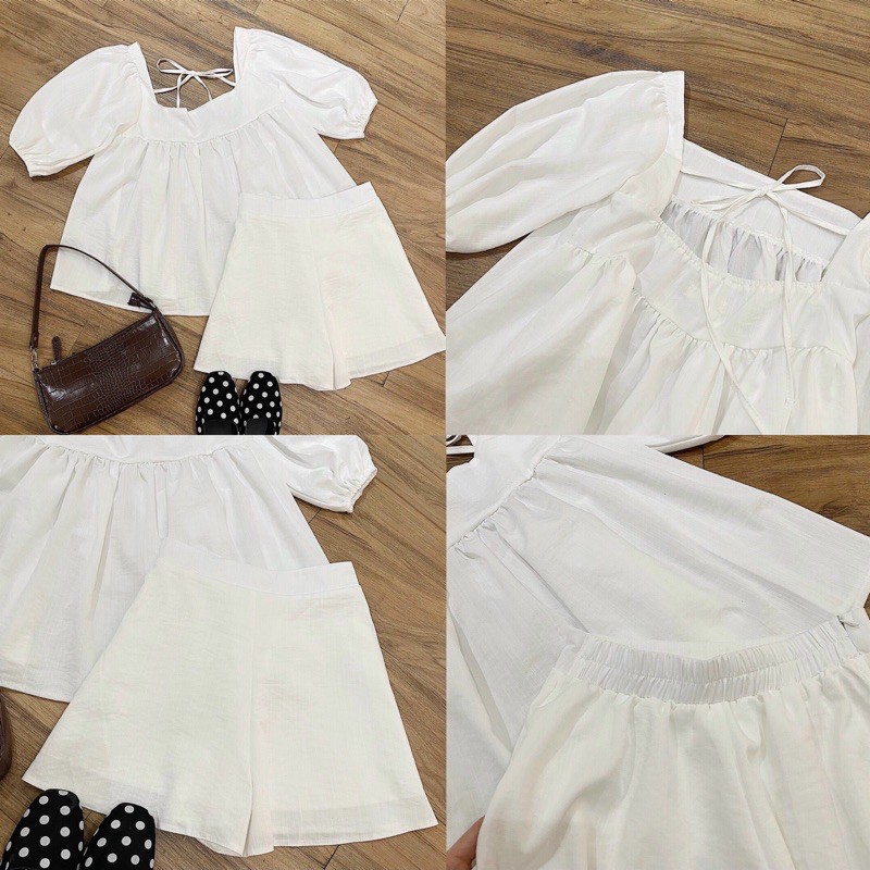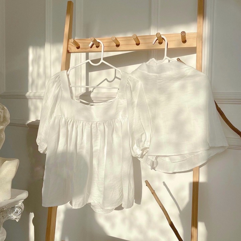 Set đồ màu trắng gồm áo babydoll trắng kèm quần form chuẩn không kén dáng Sun Fashion