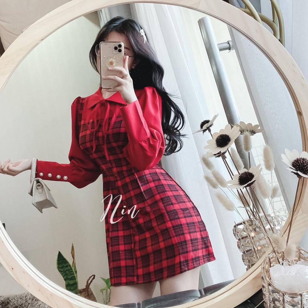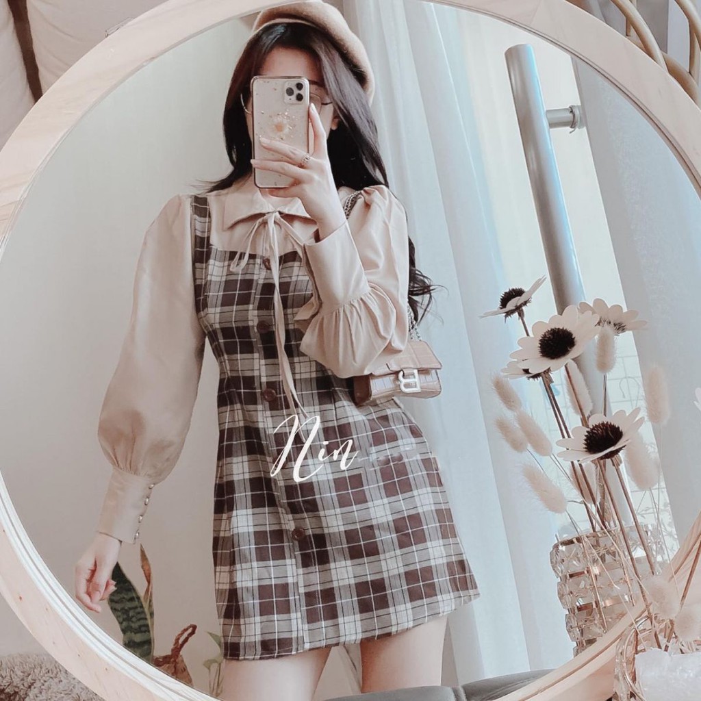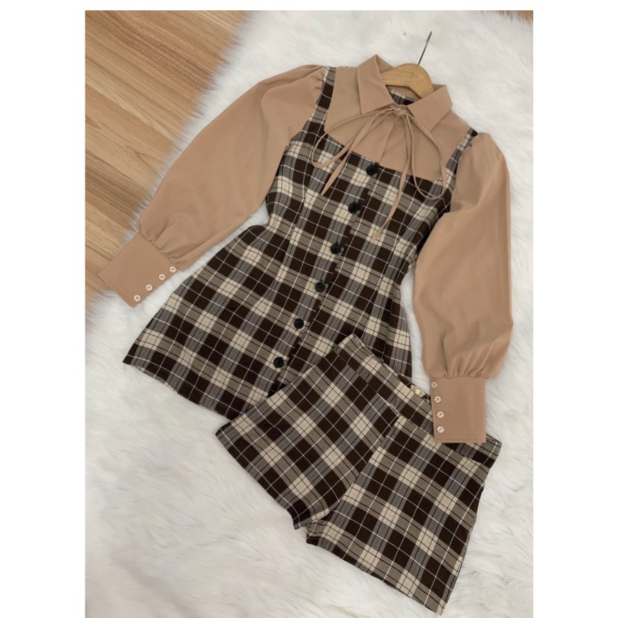 Set Đầm Sơ Mi + Phối Màu Caro Kèm Quần Chất Vải Bố Phối Tay Lụa - TTB269