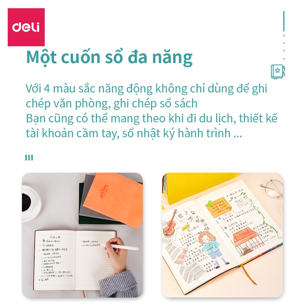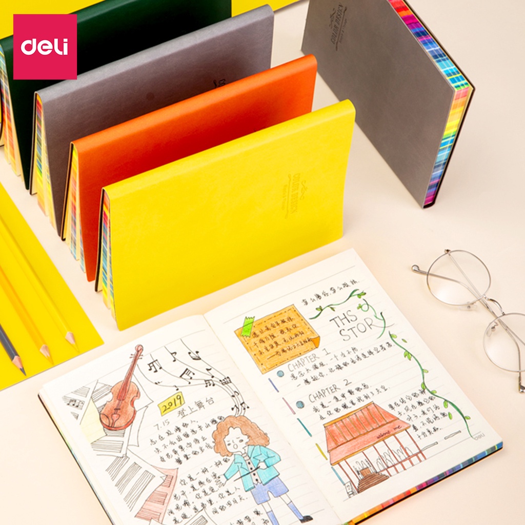 Sổ tay ghi chép A5 bìa da PU Deli 112 trang - Màu Cam/Vàng - 1 quyển - Giấy chống lóa mắt - Phù hợp học sinh, văn phòng