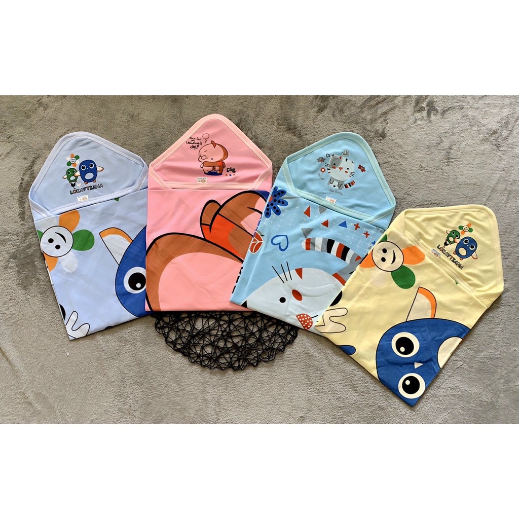 Ủ kén có mũ cho trẻ sơ sinh FUSJ thêu hình, khăn ủ Hè - Thu cho bé, chăn choàng Fusj, chăn ủ xô, quấn kén cho bé